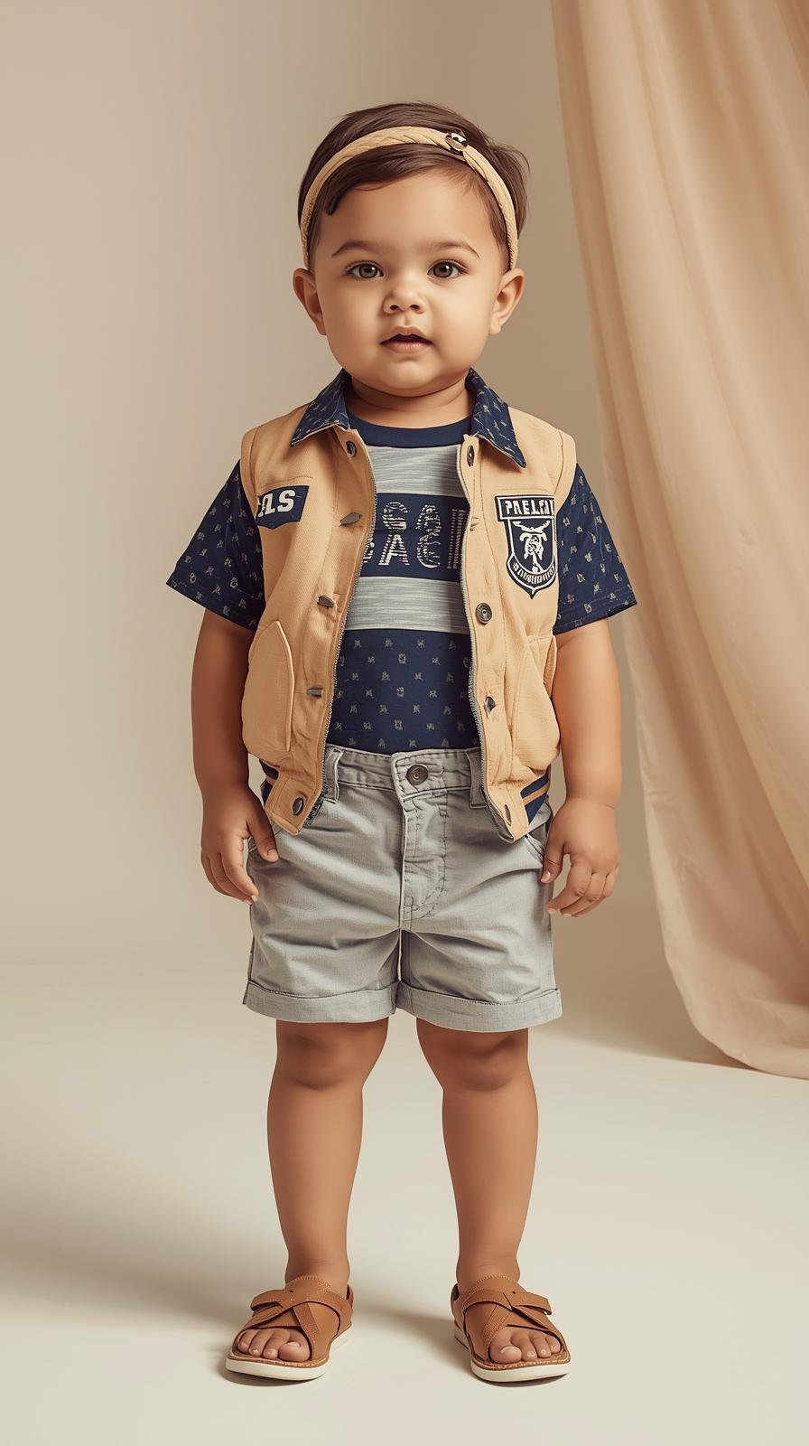 Give your baby a fun, layered look perfect for mild summer days with the Azul Threads Utility Vest Summer Outfit. This stylish ensemble features a casual Snap-Front Vest in a warm tan or khaki color, which adds a cool, utility-inspired layer over a Navy Blue T-shirt adorned with a charming subtle pattern. This layering technique provides a trendy look while the lightweight fabrics ensure your little one stays comfortable without overheating during daytime adventures.