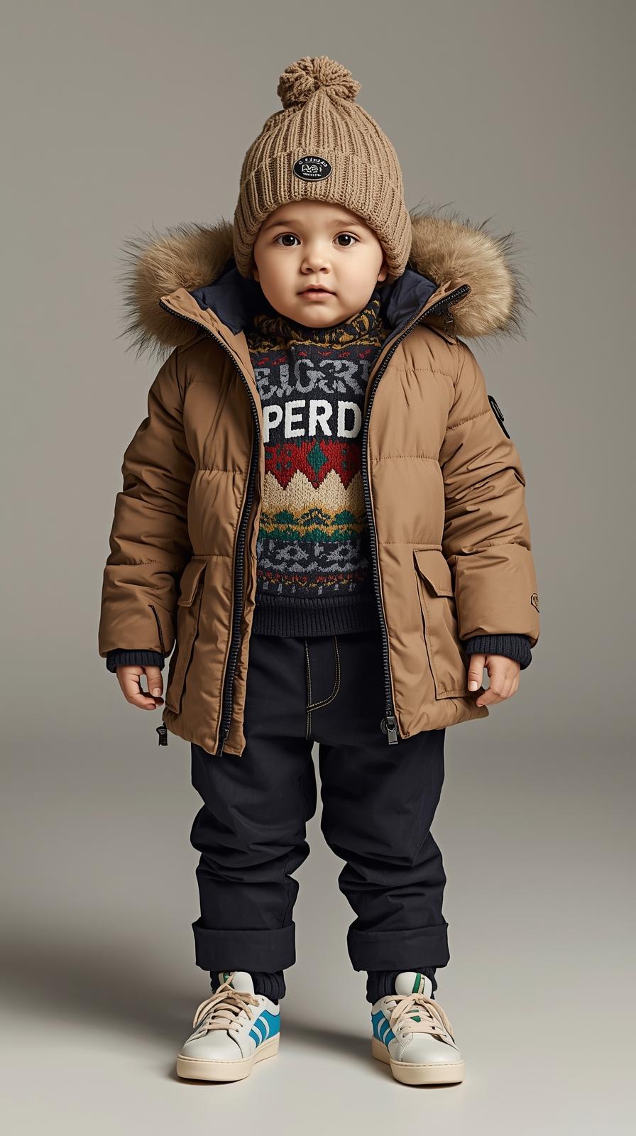 + Free ShippingLayered beneath the coat is a beautiful Fair Isle Knit Sweater in a dark base color with a contrasting, festive pattern of red, green, and cream. This chunky knit adds essential warmth and a classic winter texture to the ensemble. The outfit is completed with dark Tailored Trousers and miniature sneakers, creating a smart yet functional look. This set perfectly balances high-quality, cold-weather necessity with an irresistible, fashionable aesthetic.