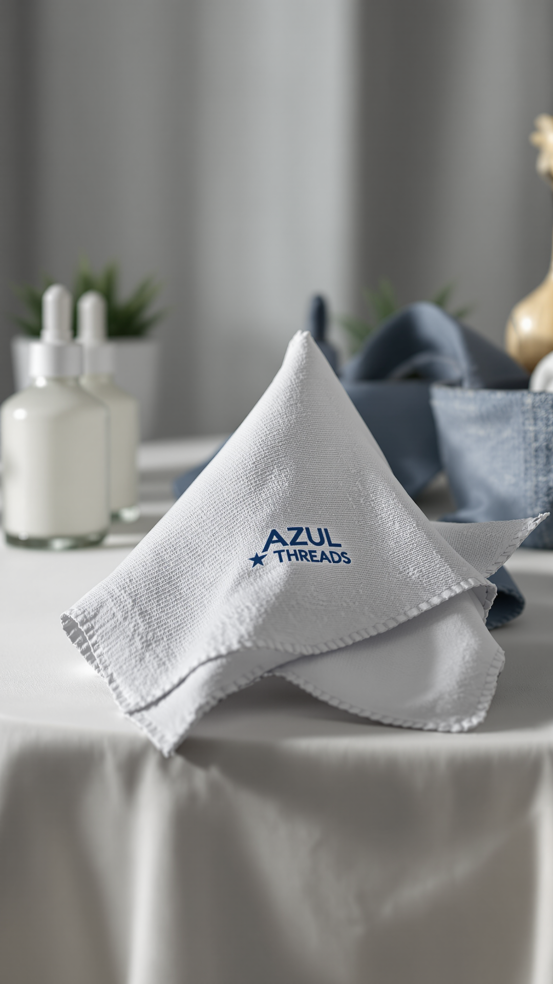 The napkin is styled on a white tablecloth, creating a luminous, clean aesthetic that highlights the napkin’s sharp folds and vibrant blue text. The AZUL THREADS Table Napkins are perfect for both corporate events and home dining, offering a sophisticated and professional way to present your brand or simply elevate your tableware with a distinct, clean design.