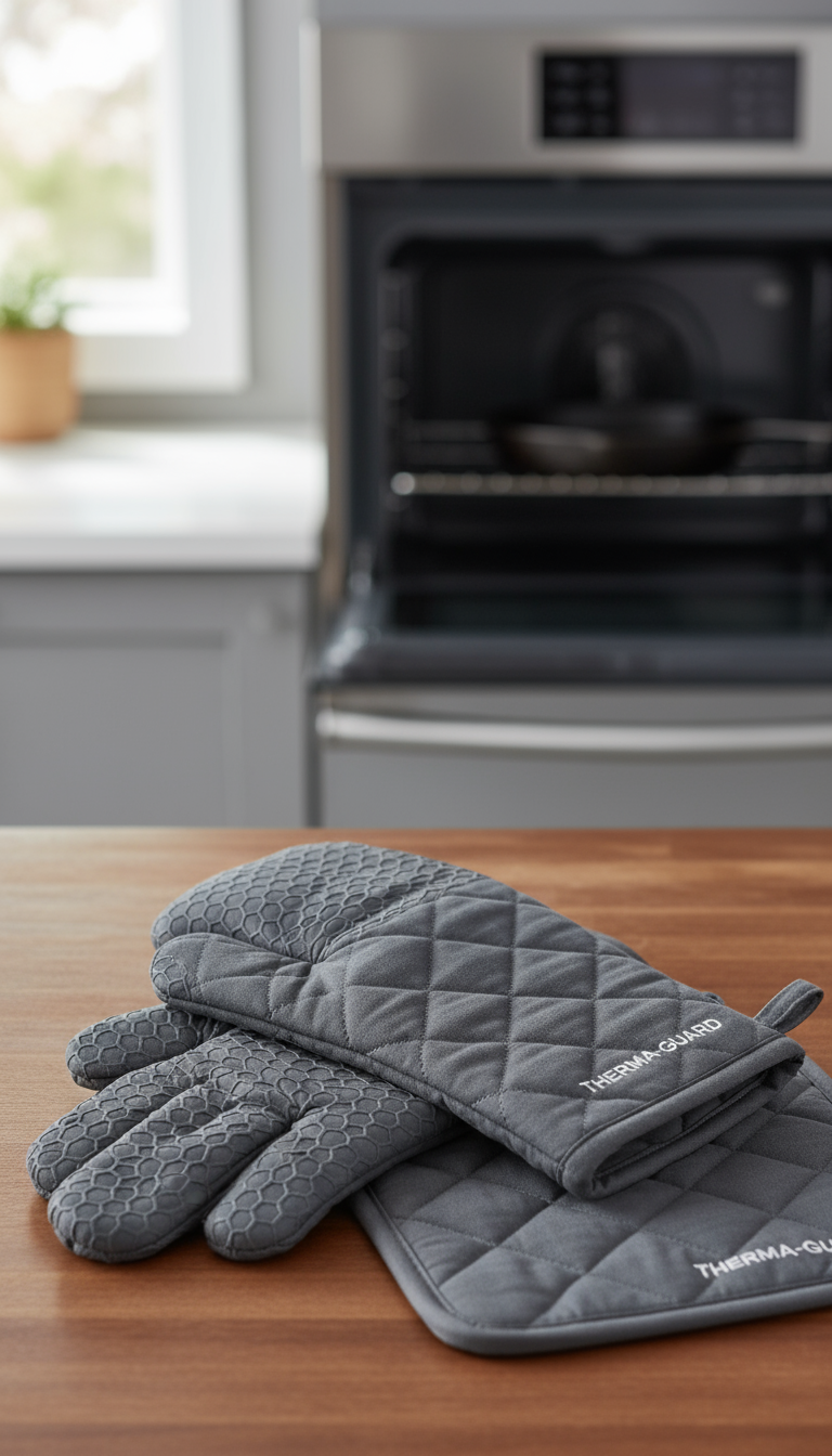 Each item is clearly branded with the “THERMA-GUARD” logo, signifying reliable heat resistance and durable quality. The versatile set includes a mitt-style glove, a full-hand glove with individual finger areas for better dexterity, and a square potholder, covering all your needs for handling hot items. These essential kitchen accessories are both highly functional and stylish, making a practical addition to any modern kitchen.