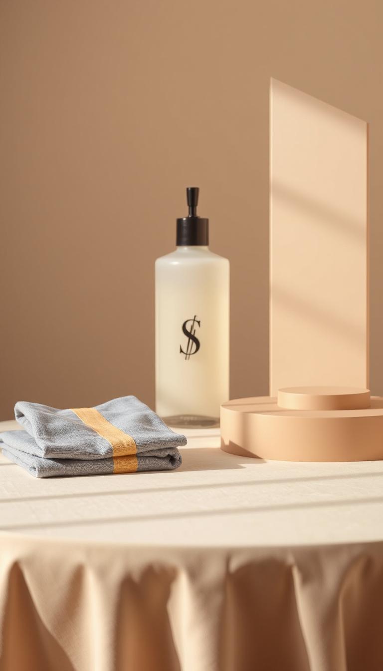 + Free ShippingCreate a chic, professional backdrop for your items with our Elegant Display Table Covers. This versatile cover is presented in a sophisticated light tan or neutral beige color, featuring a soft fabric that drapes beautifully over the table, creating gentle, attractive folds. It serves as the perfect foundation for minimalist or product-focused displays, as shown by the modern dispenser bottle and beige risers. The subtle color ensures that the focus remains entirely on the items placed on top, allowing for clean, effective visual merchandising.