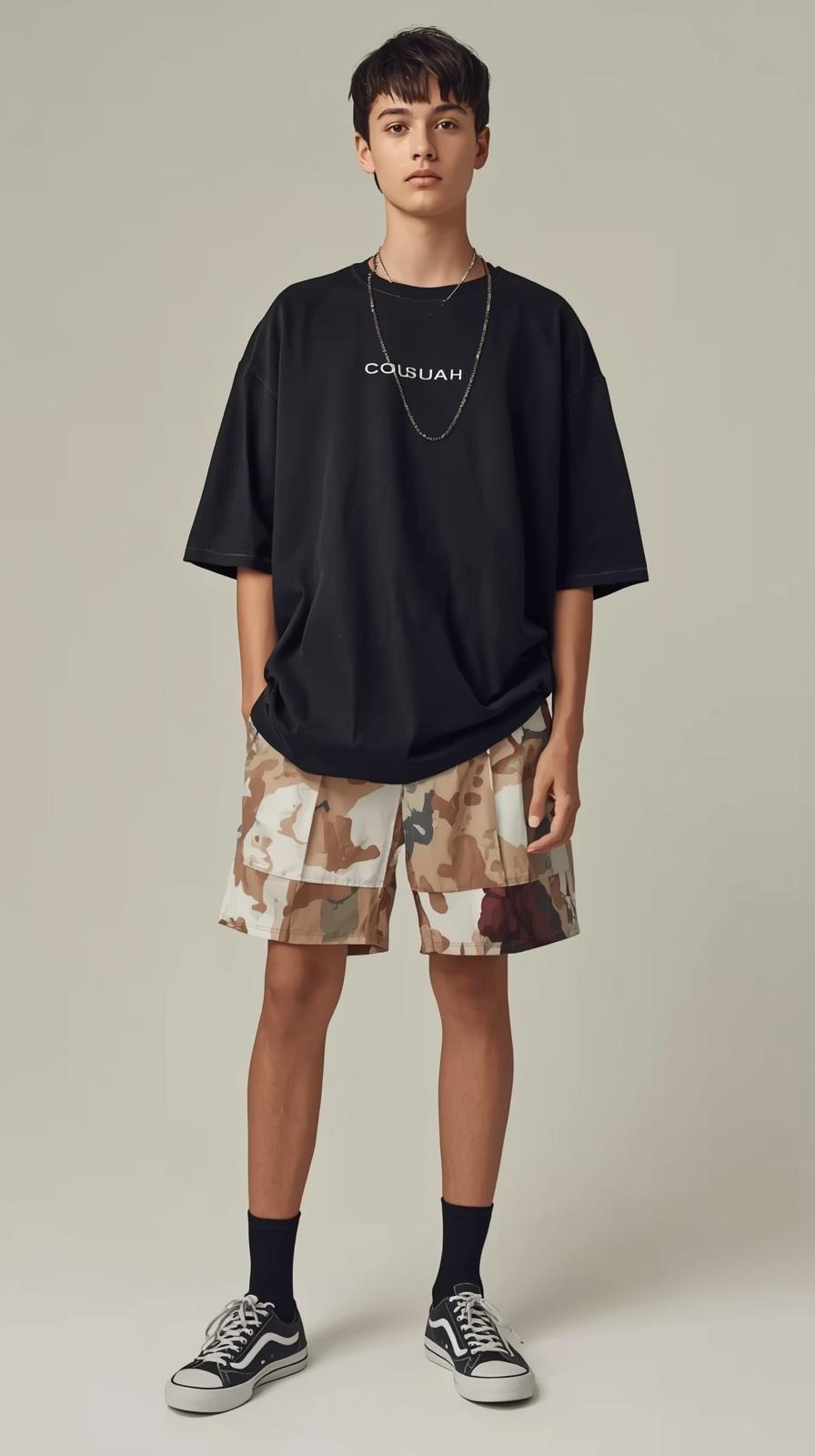 The look is completed by the statement Camo Shorts. These shorts feature a bold, earthy camouflage pattern (maroon, khaki, and brown) in a length that hits just above the knee, offering both comfort and functional style. Designed to be worn with ease, this set is perfect for everything from skate park sessions to casual weekend meetups. It effortlessly combines comfort, utility, and cutting-edge streetwear fashion for the ultimate summer statement.
