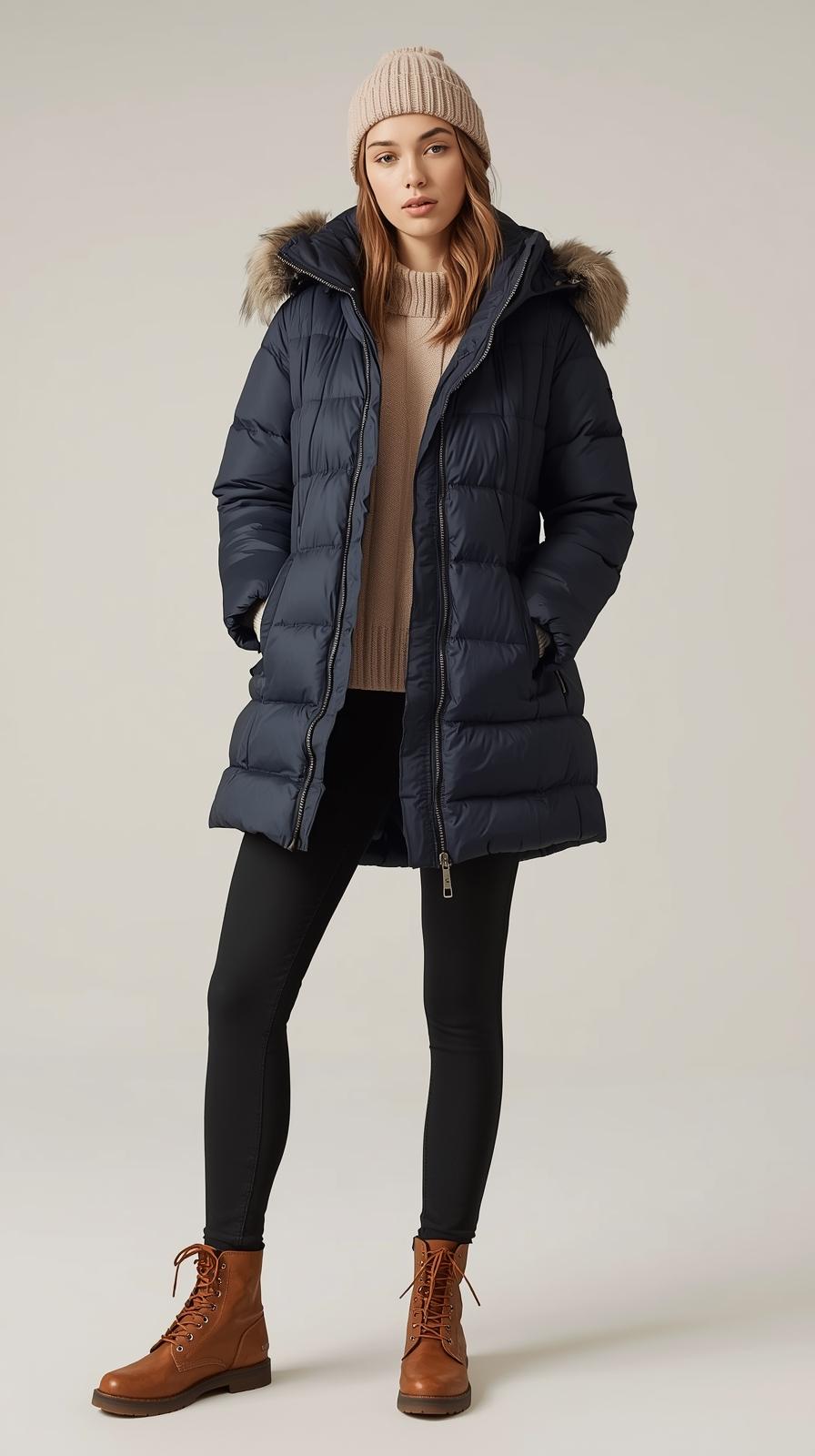 Layered underneath the coat are a soft, neutral-toned Knit Sweater and essential Black Skinny Jeans or leggings, creating a clean, modern base layer. The dark base allows the beautiful texture and color of the navy coat to stand out. Completed with a warm beanie and durable lace-up boots, this ensemble provides a perfect balance of fashion and function, making it the ideal choice for facing winter days with confidence and superior comfort.