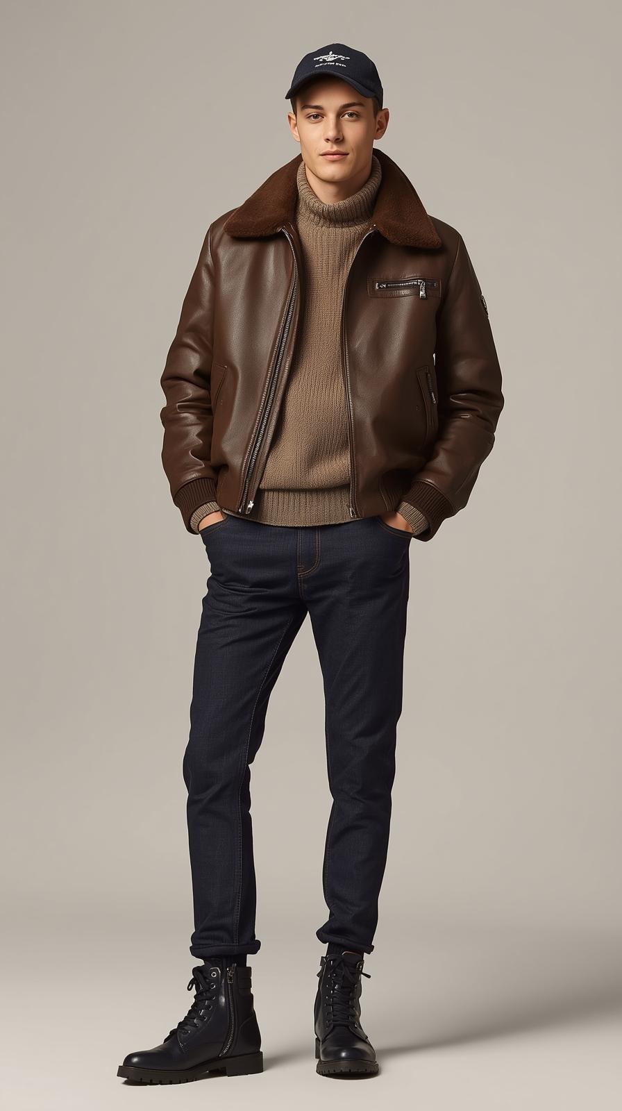 Layered underneath is a stylish Chunky Gray Roll-Neck Sweater, providing crucial insulation and a refined contrast to the jacket’s smooth leather finish. The outfit is grounded by sharply tailored Charcoal Plaid Trousers and polished leather dress shoes, proving that leather outerwear can be seamlessly integrated into sophisticated attire. This ensemble is the perfect balance of rugged edge and refined style, making it ideal for date nights, evening outings, or high-end casual events.
