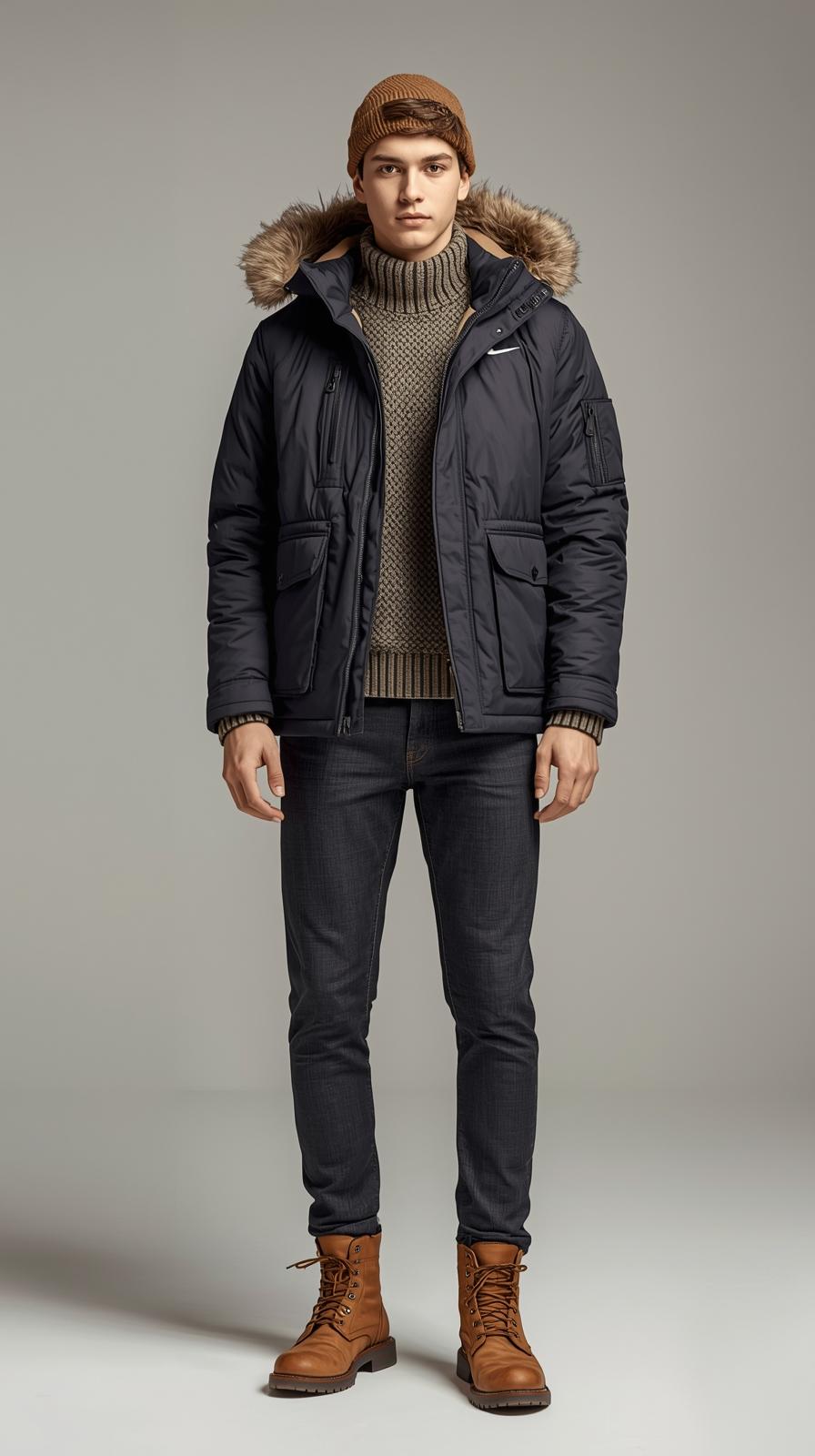This outfit is grounded by a pair of Dark Wash Slim-Fit Jeans and rugged Lace-Up Leather Boots. The dark denim offers a clean, versatile base, while the boots add a masculine, all-weather finish. Completed with a warm knit beanie, this entire look expertly blends high-performance winter gear with everyday style, making it ideal for navigating city streets, hiking trails, or simply staying warm while looking effortlessly put-together.