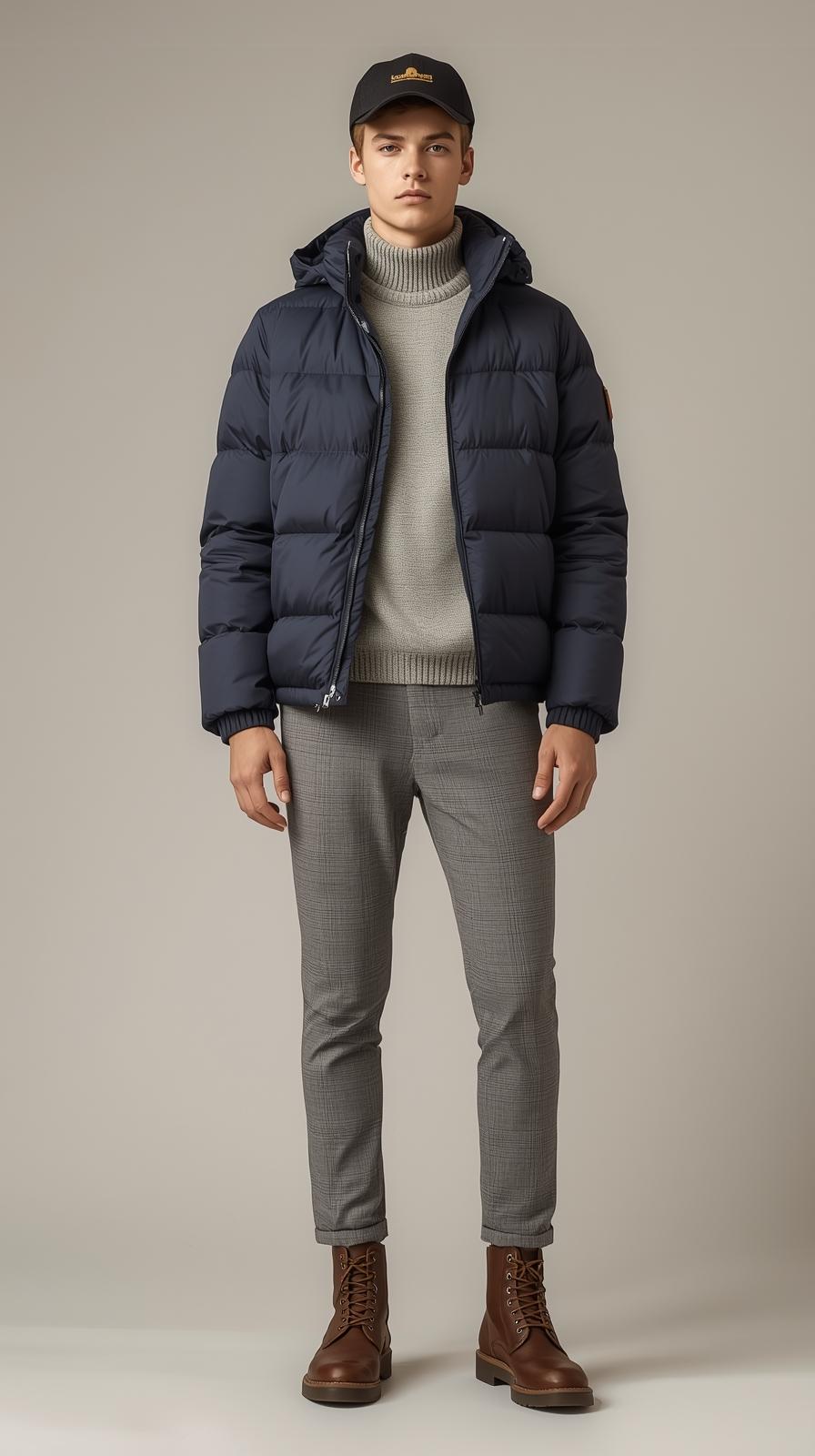 The outfit is given a sophisticated, modern edge with Grey Plaid Trousers. These slim-fit trousers offer a refined texture and pattern, perfectly balancing the sporty nature of the puffer jacket. The look is finished with rugged lace-up boots and a simple cap, making the ensemble ready for anything from a casual day at school to a weekend trip. This pairing is the perfect way to combine athletic functionality with sharp, everyday style.